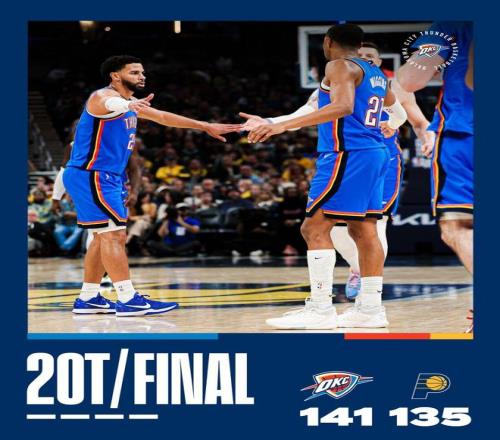 沃克外线不中,维金斯与谢泼德对射三分球。谢泼德6次犯满离场,霍姆格伦连续补篮终于打进。西亚卡姆中距离得分,亚历山大2罚全中,托平快速上篮得手。亚历山大罚进2球,托平外线不中,比赛时间走完。最终,雷霆以141比135力擒步行者,得以实现2连胜。