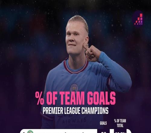 英超冠军头号射手进球比例榜:希勒亨利C罗前三,哈兰德38.3%第四 -